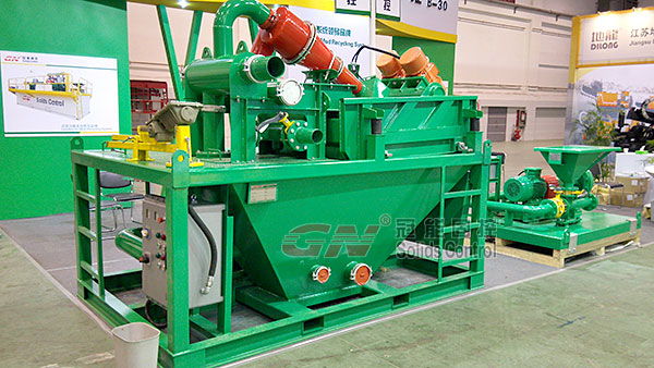 本次展會主要展出了120m³/h處理量的泥漿回收系統(tǒng)及配套的射流混漿系統(tǒng),主要配置了一臺GNZY753E-Y1S型篩泥一體機,雙層篩網(wǎng)設計,面積達到2.225m³,可分離固相粒度40微米,旋流器采用高質量聚氨酯材質,耐磨,使用壽命長,振動電機采用國際意大利OLI品牌或者美國馬丁品牌,篩箱底框采用不銹鋼材質,振動強度達到7.1G(可調),并配有GNSB6×5A(37KW)離心泵為除泥供漿泵,采用機械密封,使用壽命長并便于維修。整套系統(tǒng)撬裝設計,移動便捷,使用方便。