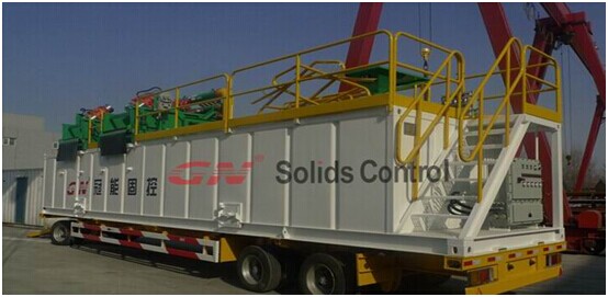 冠能150GPM泥漿系統(tǒng)配置如下 1、1臺(tái)GNZS703D雙層振動(dòng)篩上安裝了3個(gè)4寸除泥旋流器,通過GNZS703D雙層篩可以把粗砂除去,然后通過除泥旋流器把20um左右以上的顆粒在分離除去, 2、2臺(tái)GNSB4X3-12J的砂泵安裝在泥漿罐斜倉上,1臺(tái)用于給除泥器供漿,另外1臺(tái)作為混漿泵使用。 3、4米長(zhǎng)的泥漿罐,非常緊湊的設(shè)計(jì)跟合理的布局,對(duì)于狹小的鉆井空間非常適宜。