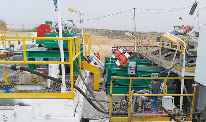 兩臺(tái)高G干燥篩放置于低高度的泥漿罐上面,在把整個(gè)干燥裝置放置于鉆機(jī)的振動(dòng)篩下面。
